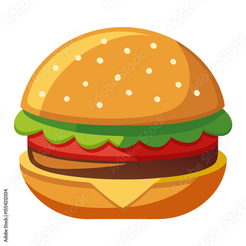 Cartoon illustration of a delicious hamburger with cheese tomato lettuce and sesame seed bun isolated on a white background perfect for menu design or fast