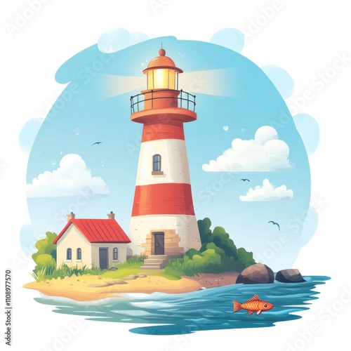 lighthouse, island, ocean, house, summer, sea, beach, nature, coast, travel, vacation, landscape, sky, cloud, fish, sunrise, sunset, illustration, cartoon, cute, happy, red, white, calm, peaceful, beautiful, scenic, view, spring, holiday, tour tourism, adventure, explore, landmark, destination