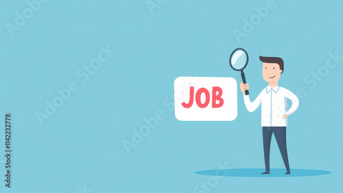 Cartoon illustration of man holding magnifying glass over word JOB in bright blue theme, minimalist style, conveying professional quality with ample copy space