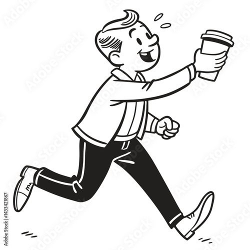 cartoon, man, running, hot drink, cup, take-away, fast, pace, full body, black-and-white, line art, joyful, cheerful, expression, speed, outline, monochrome, silhouette, vintage, retro, character, male, person, business, hurry, morning, caffeine, energy, beverage, hot, drink, disposable, container, lifestyle, positive, active, movement