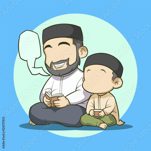 family, ramadan, cartoon, mascot, islamic, smiling, peaceful, fasting, crescent moon, mosque, spiritual, prayer, vector, illustration, digital artwork, gentle, modest, religious, children, father and son, teaching, guidance, faith, serene, respectful, calm, friendly, bonding, joyful, colourful, eid, devotion, holy book, education, pious, cultural