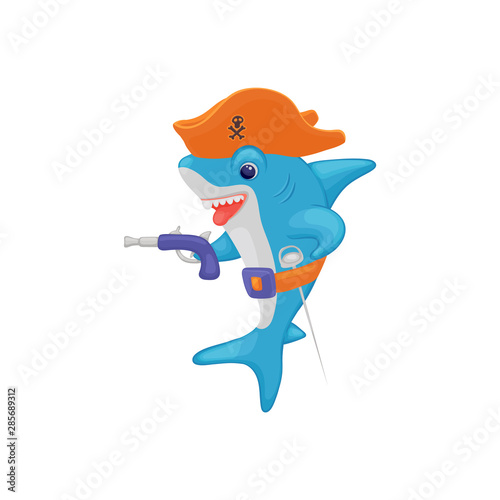 Cartoon pirate shark holding a gun, funny sea animal in full play costume wearing a hat