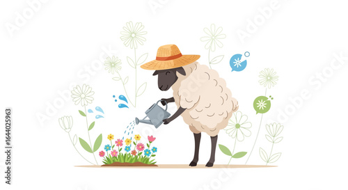 Cartoon sheep watering flowers in a garden with a watering can and straw hat illustration