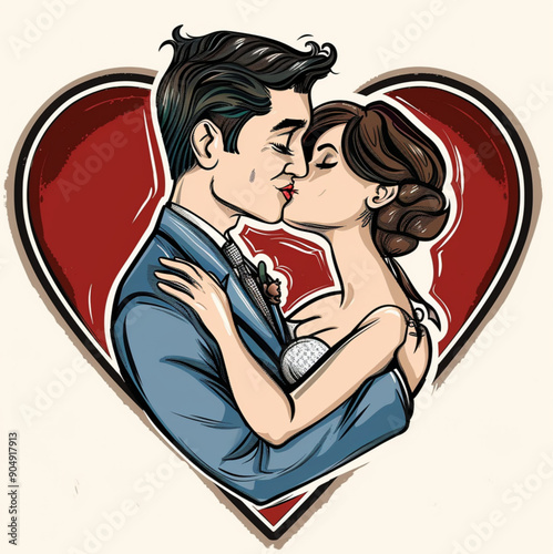Cartoon-style drawing, groom in suit with blue jacket and grey tie, kissing the bride by embracing her, inside a thin red heart