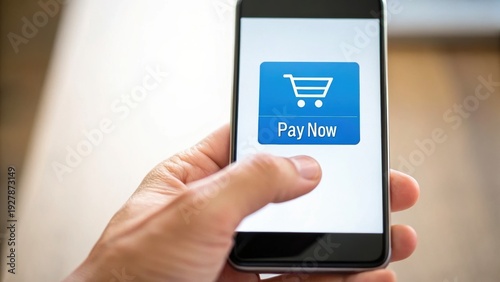 Cashless society behavior Hand holding smartphone displaying a blue "Pay Now" button with a shopping cart icon on the screen.