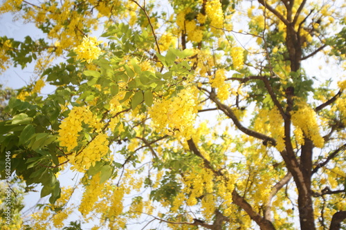 cassia fistula. golden rain tree a flowering plant in the family Fabaceae. The species is native to the Indian subcontinent. known in Thai as ratchaphruek. tree in full yellow bloom.