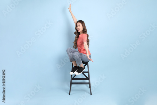 woman, person, asian, female, isolated, young, girl, beautiful, attractive, adult, pink, fashion, cute, pretty, model, chinese, japanese, sitting, studio, background, korean, blue, colourful, pastel, pose, shy, trendy, lovely, confident, relax, chair