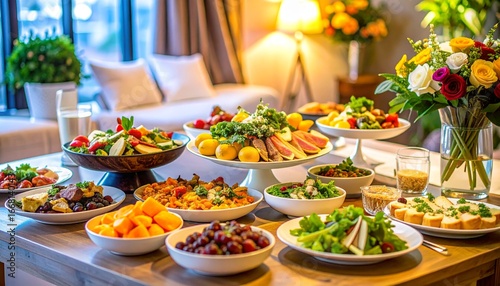 Casual buffet setup with elegantly arranged dishes, fresh salads, appetizers, desserts, drinks, rustic and inviting tables, vibrant presentation, cozy indoor or outdoor dining atmosphere