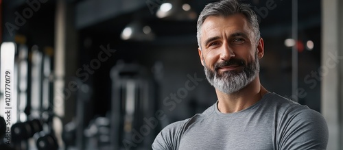 Casual gym coach with gray hair and beard smiling in fitness center with exercise equipment and ample space for text on left side