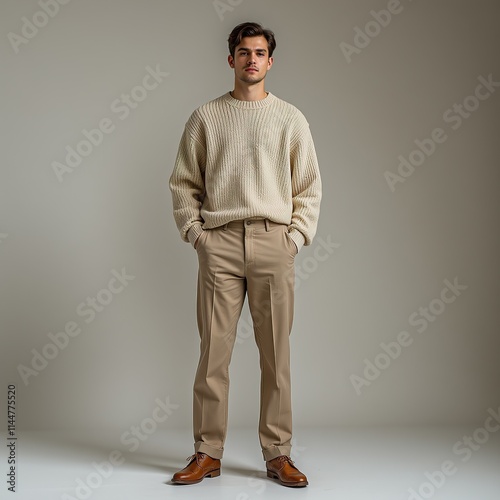 man, casual attire, beige, sweater, khaki, pant, relaxed, standing, male, model, comfortable, fashion, stylish, casual clothes, modern, neutral, indoor, light background, adult, one person, outfit, autumn, cosy, approachable, neat, clean, informal, casual attire, minimalist, calm, fashion model, tan, simplicity, timeless, trendy, easygoing, photogenic, person, shirt, guy, business, man, people