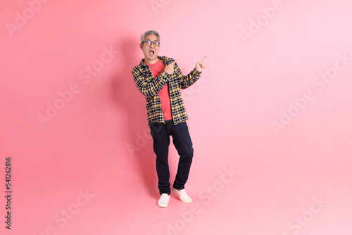 person, portrait, man, asian, 40s, male, isolated, adult, full, body, background, smart, length, studio, standing, casual attire, grey, japanese, chinese, colours, pink, fashion, plead, goggles, pointing, gesture, showing, finger, hand, signs, direction, advertisement, presenting, copy space, happy, smile, surprised, exciting