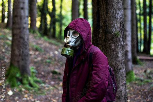 casual young man in a gas mask standing on the forest. Ecological catastrophy. Post apocalyptic survivor in gas mask. Man at forest.