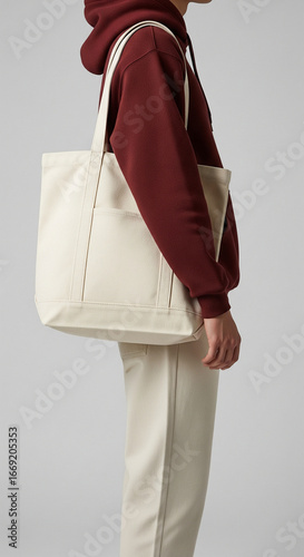 person, tote, bag, casual attire, fashion, lifestyle, shoulder, attire, relaxed, personal, friendly, student, everyday, human, sustainable, chic, utility, essential, plain, professional, daily, hold, contemporary, hard-wearing, canvas, commuting, work, carry, body, wear, pant, arm, outfit, neutral, garment, racked, comfortable, practical, side, burgundy, unisex, beige, comfort, stylish, light, grey, shopping, functional, maroon