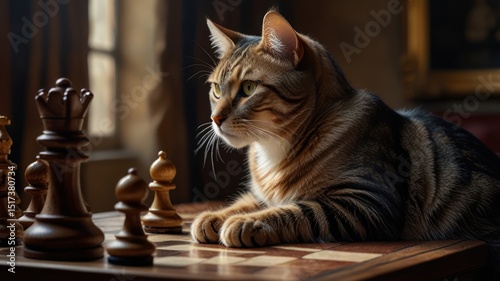 cat, chess, game, contemplation, intelligent, animal, table, wooden, dark, room, window, light, shadow, profile, gaze, focused, still, peaceful, playful, thoughtful, strategy, observe, mulling, expert, waiting, patience, strategic, thinking, curious, intrigued, sharp, close, detailed, composition, perspective, photographic, art, still life, classic, elegant, sophisticated, captured, moment, nature, pet, domestic