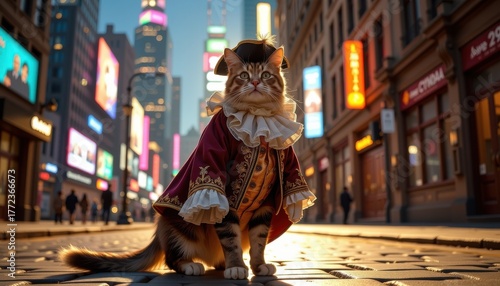 cat in historical costume concept. Elegant Cat Historical Costume Amid Neourban City Scene