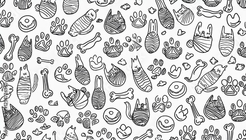 Cat toy, fooprint pattern seamless. Hand drawn sketch doodle kitty cute element on white background. Fish bone, footprint, cat toy element. Pet veterinary pattern. perfect any project.