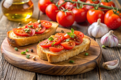 catalan, spanish, garlic, tomatoes, olive oil, wooden board, closeup, aerial view, food, cookery, mediterranean, traditional, delicious, snack, healthy, fresh, ingredient, culinary, gastronomy