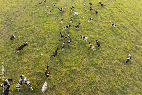 Cattle grazing on farmland pasture. Production of organic dairy products. Milk cows feeding on green farm grassland