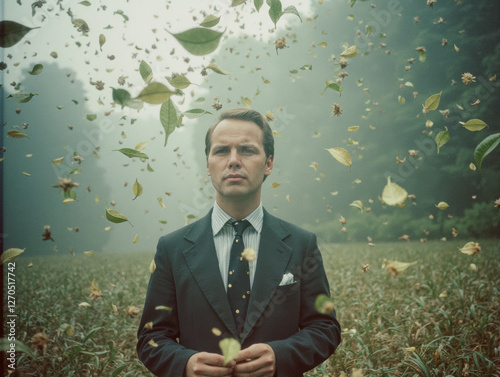 caucasian, male, adult, suit, leaf, standing, misty, field, nature, autumn, outdoors, serene, formal, attaching, greenery, landscape, foggy, tranquil, isolated, contemplation, peaceful, elegant, serious, calm, grass, season, foliage, solitude, mysterious, thoughtful, environment, atmospheric, picturesque, sombre, weather, overcast, earthy, sophisticated, crisp, reflective, distant, moody, muted, scenic
