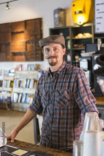 authentic, authenticity, barista, beard, brunette, cafes, cashier, hot drink, cafes, college students, color image, confident, counter, curled, curly, entrepreneur, food and drink, goatee, happiness, hat, hipster, indoor, lifestyle, man, moustache, land of enchantment, one person, people, photo, pleasure, portrait, posing, real people, santa fe, service, small business, smiling, standing, student, us, vertical, waist up, white, men at work, working