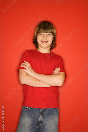 boy, children, male, teenage, red, smiling, portrait, arms crossed, colours, vertical, indoor, image, person, half-length, studio shot, posed, photograph, eye contact, looking, colours, caucasian