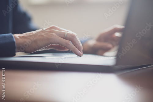 Caucasian female hand using laptop computer for work lit by the sunlight