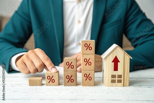 percentage, rate, interest, house, home, mortgage, loan, finance, property, building, block, wood, wooden, model, caucasian, hand, finger, stack, arrangement, arrow, upward, increase, investment, sale, rent, real estate, market, price, growth, economy, risk, savings, revenue, symbol, debt, banking, pay, financial