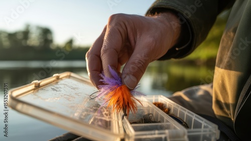 Caucasian male hand selecting colorful fishing fly lure from tackle box by tranquil lake