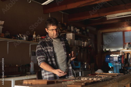 one person, mature adult, man, male, caucasian, people, knife, maker, standing, desk, preparing, workshop, independent, small business, craftsman, work, men at work, job, tool, professional, office, occupation, workplace, manufacturing, carpenter, craft, industry, repair, artisan, equipment, making, manual, skill, table, carpenter's shop, laptop, small, business
