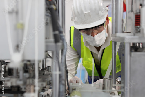 Caucasian mechanic technician maintenance, repairing industrial machinery equipment in factory. Professional worker in protective clothing with goggles and mask using wrench at manufacturing factory
