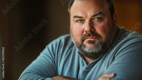 Caucasian overweight man with beard and blue eyes in light blue shirt looking directly at camera with serious expression, arms crossed, close up. Business and personal reflection