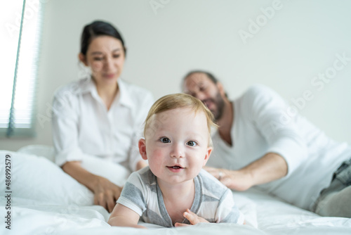 Caucasian parents playing with cute baby boy child on bed in bedroom.