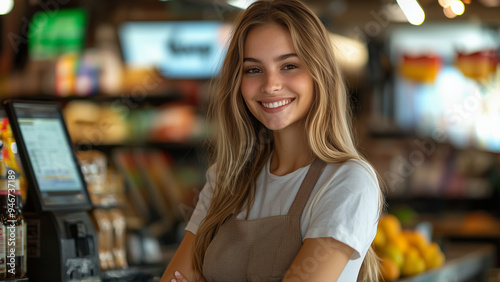 Caucasian White Woman Cashier - cashier, store, shop, retail, uniform, customer service, smiling, groceries, counter, market, worker, young woman, sales, friendly, employee