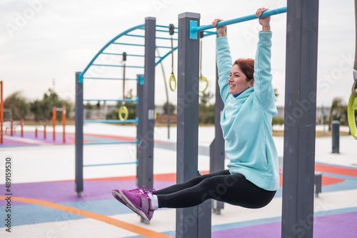 Caucasian woman in a mint sweatshirt hangs on a horizontal bar and does an exercise of the abdominal muscles on the sports ground outdoors.