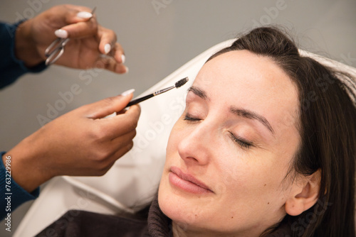 Caucasian woman removing hair from eyebrows with thread technique done by eyebrow stylist. Threading. Process Steps. Close up