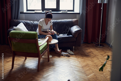 training, offline, sofa, soft, adult, apartment, casual attire, isolation, caucasian, quarantine, clothes, study, domestic, female, home, house, indoor, interior, lifestyle, room, woman, young, modern, lady, cute, nice, use, beautiful, pretty, charming, positive, device, tied-up, technology, laptop, computer, to sit, earphones, smartphone, coach