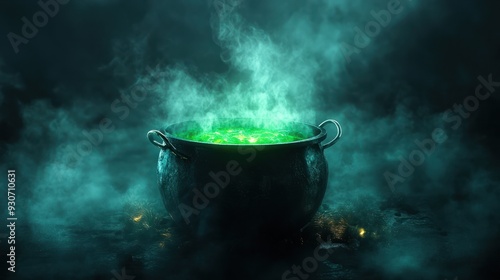 Cauldron with green glowing potion isolated on a dark foggy background