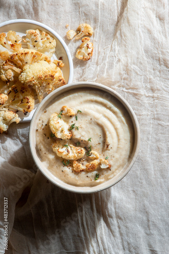 cosy, monochromatic, monochrome, neutral, bowl, cauliflower, fall, food, organic, roast, roasted, soup, soup bowl, topview, vegetable, vegetarian, vertical, warm, winter
