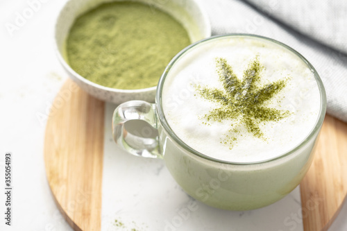 CBD or THC infused Matcha tea on white marble. Cannabis leaf tea. Warm vibes and relaxation. Healthy alternative to smoking or vaping. Medical or recreational use.