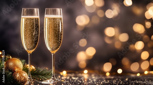 Celebrate the festive season with two elegantly filled champagne flutes beside golden ornaments and twinkling lights