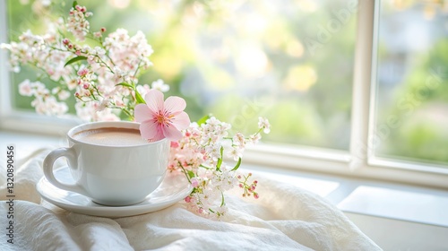 spring flower, coffee cup, morning light, blurred background, fresh flower, soft light, natural light, floral arrangement, relaxation, comfort, serene, domestic life, tranquil
