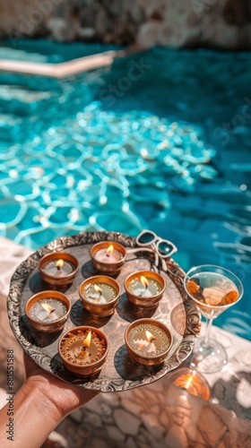 Celebrating Navaratri by the Pool Close-Up of Hand Holding Diya Tray with Sunglasses, Cocktail Glasses, and Serene Blue Water