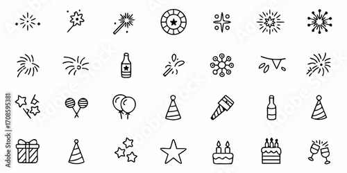 party, celebration, festive, birthday, event, icon, fireworks, balloon, gift, present, cake, champaign, star, confetti, sparkle, fun, happy, joy, anniversary, new year, christmas, holiday, cheer, toast, decoration, design, symbol, doodle, vignetting, outline, black-and-white, graphic, illustration, vector, set, collection, element, invitation, greeting, card, banner, web design, typography, icon