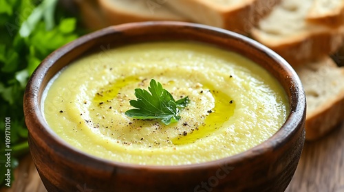Celery soup in a rustic bowl, served with toasted bread and garnished with olive oil and parsley