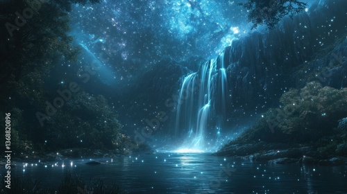 waterfall, starlight, night, fantasy, landscape, mystical, glowing, serene, tranquil, magical, forest, river, aethereal, cascade, nature, luminescence, dark, dreamy, galaxy, sparkling, peaceful, enchanted, timberland, celestial, cosmos, midnight, glimmering, nocturnal, pristine, secret, vista, idylli, shimmering, foliage, wilderness, water, calm, purity, harmony, beauty, scenic
