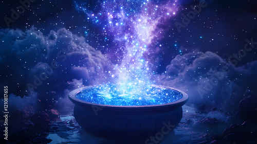 Celestial cauldron overflowing with stars, a mystical vessel unleashing a cascade of shimmering galaxies into the night sky. Stellar Cascade. Illustration
