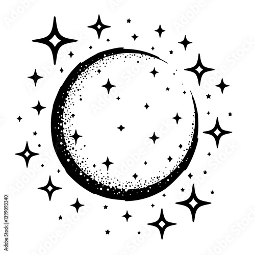 Celestial Crescent Moon and Stars: Black and White Minimalist Illustration