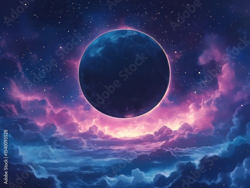 planet, eclipse, cosmos, space, universe, star, galaxy, cloud, celestial, astronomic, aethereal, nebula, cosmic, atmosphere, darkness, light, glow, purple, blue, pink, abstract, dreamy, fantasy, vibrant, beautiful, scenic, artistic, illustration, digital artwork, planetary, outer space, night sky