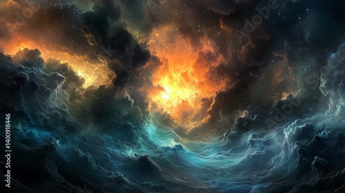 cloud, space, storm, cosmos, nebula, galaxy, fire, sky, astral, heavenly, celestial, universe, fantasy, digital, art, artwork, colours, orange, blue, dark, light, energy, power, dramatic, intense, vibrant, texture, depth, mystery, wonder, imagination, creation, abstract, surreal, artistic, painting, design, illustration, graphic