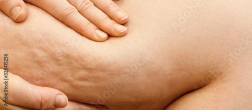 Cellulite leg woman pinch. Test fat hips treatment. Over weight liposuction. Remove striae.